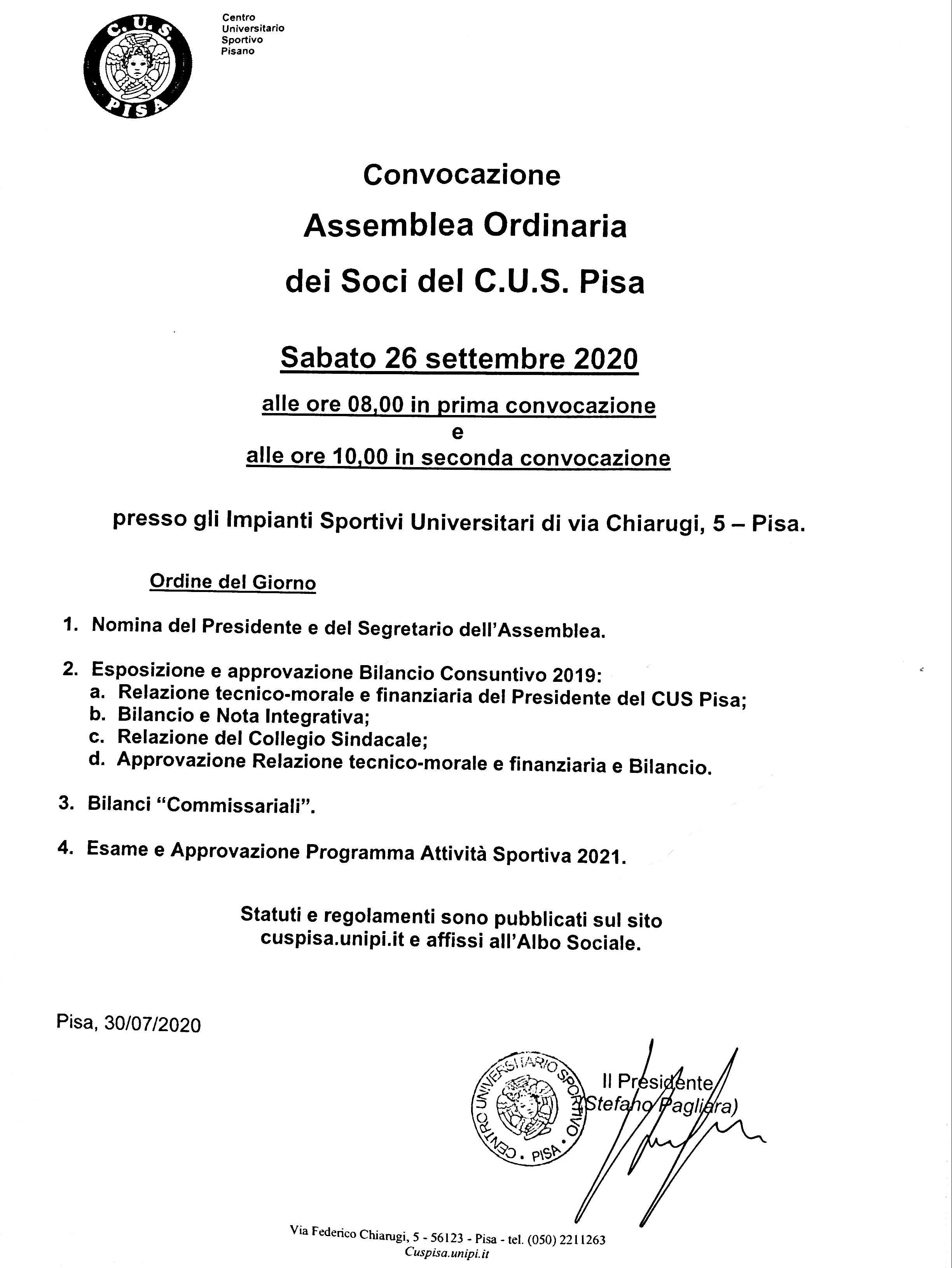 Il 26 settembre 2020, presso gli impianti sportivi del Cus Pisa (via Chiarugi, 5 - Pisa) si svolgerà alle ore 8 in prima convocazione e alle ore 10 in seconda convocazione l'assemblea ordinaria dei soci del Cus Pisa.